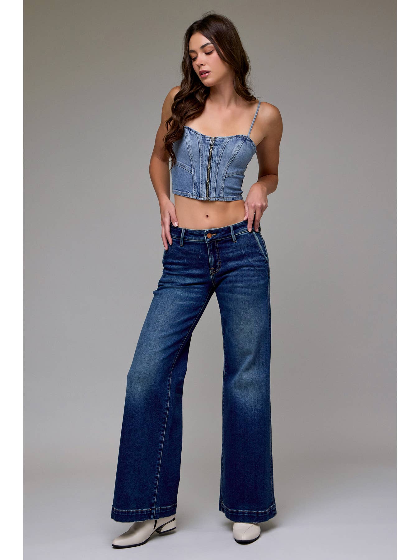 Model is wearing a size 26. Measurements are based on a size 26. 93% Cotton, 5% Polyester, 2% Spandex Front Rise – 8 1/2" Inseam – 33”