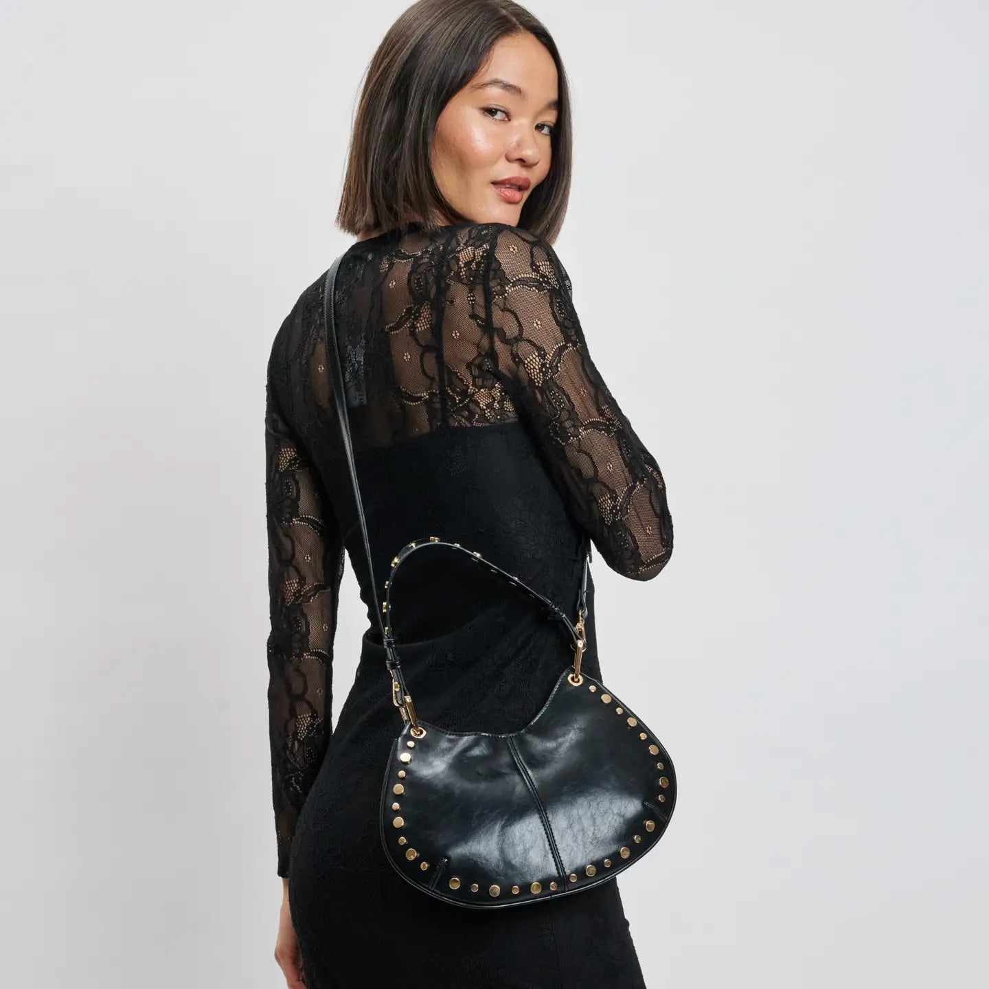 *Item Type: Crossbody *Material: Vegan Leather *Closure: Magnetic Snap *Exterior Details: Stud Details, Adjustable/Detachable Crossbody Strap, Gold Hardware *Interior Details: Fabric Lined, 1 Zip Pocket, 1 Slip Pocket